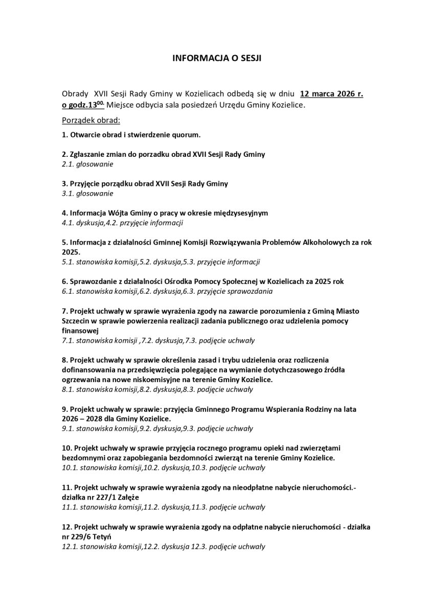 INFORMACJA O SESJI Obrady XVII Sesji Rady Gminy w Kozielicach w dniu 12 marca 2026 r. o godz.13.00. Miejsce odbycia sala posiedzeń Urzędu Gminy Kozielice