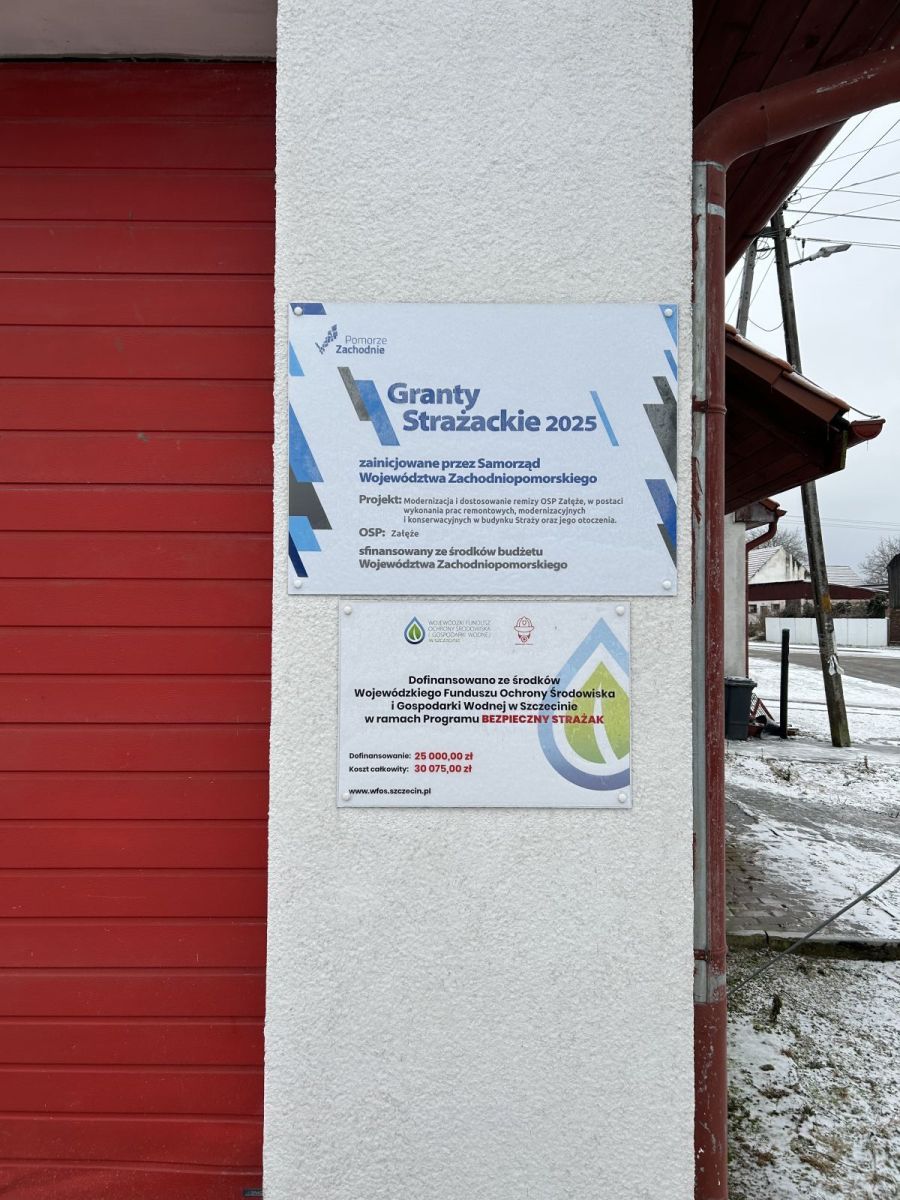 OSP Załęże zrealizowała inwestycję "Modernizacja i dostosowanie remizy OSP Załęże", na którą uzyskała od Województwa Zachodniopomorskiego dotację w ramach "Grantów Strażackich 2025" w kwocie 20 000,00 zł.