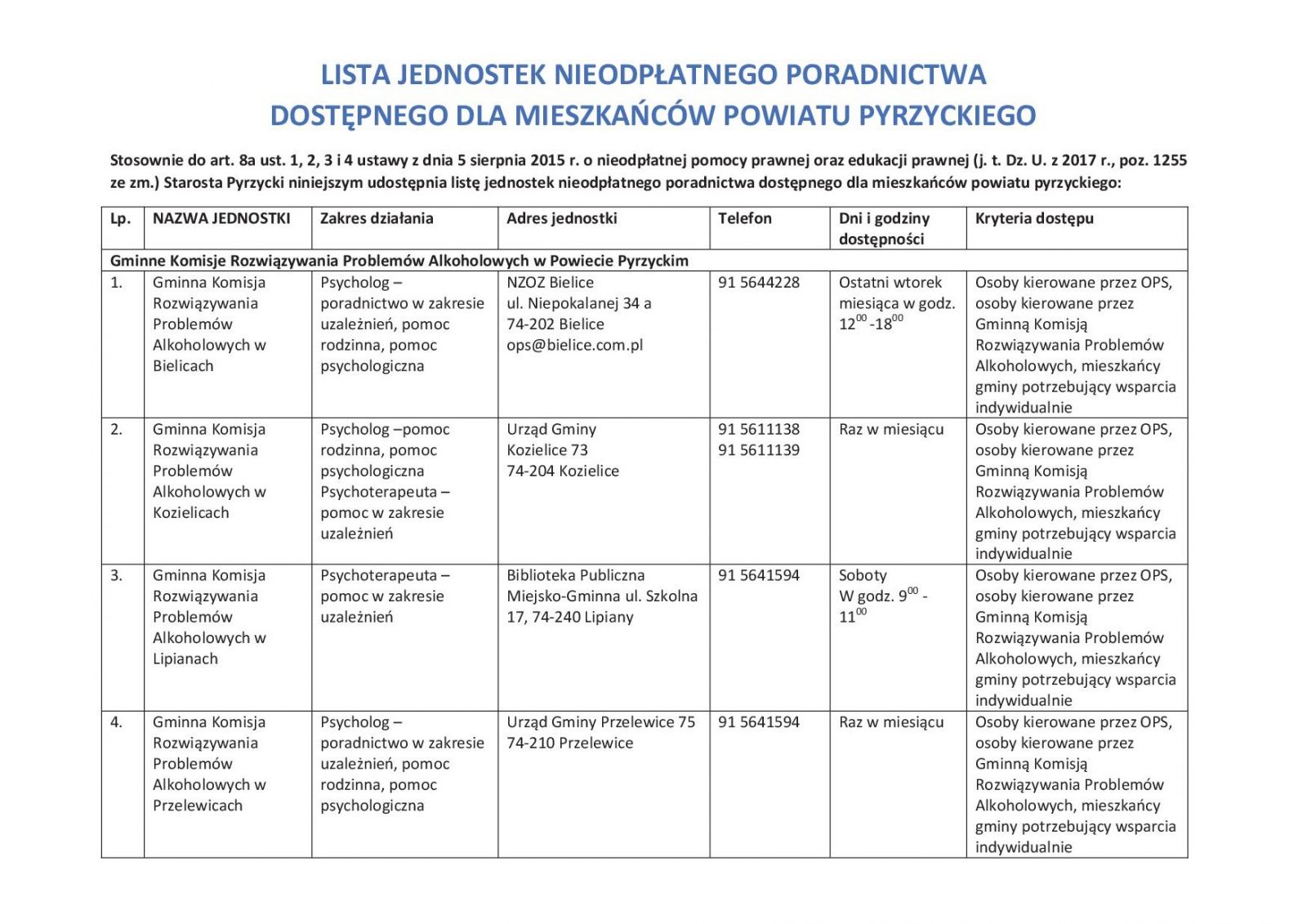 LISTA JEDNOSTEK NIEODPŁATNEGO PORADNICTWA DOSTĘPNEGO DLA MIESZKAŃCÓW POWIATU PYRZYCKIEGO