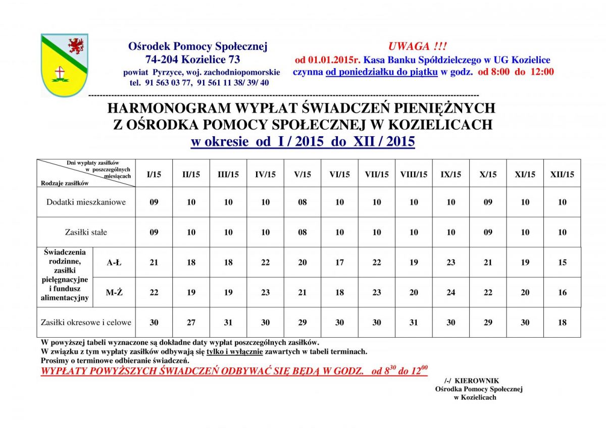 HARMONOGRAM WYPŁAT ŚWIADCZEŃ PIENIĘŻNYCH Z OŚRODKA POMOCY SPOŁECZNEJ W KOZIELICACH