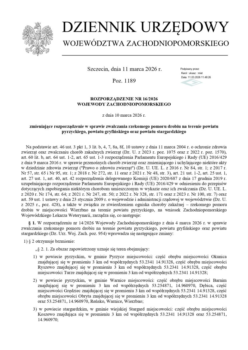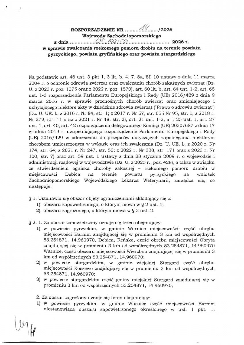 ROZPORZĄDZENIE NR 14/2026 WOJEWODY ZACHODNIOPOMORSKIEGO z dnia 04 marca 2026 roku rozporządzenie w sprawie zwalczania rzekomego pomoru drobiu na terenie powiatu pyrzyckiego,powiatu gryfińskiego oraz powiatu stargardzkiego