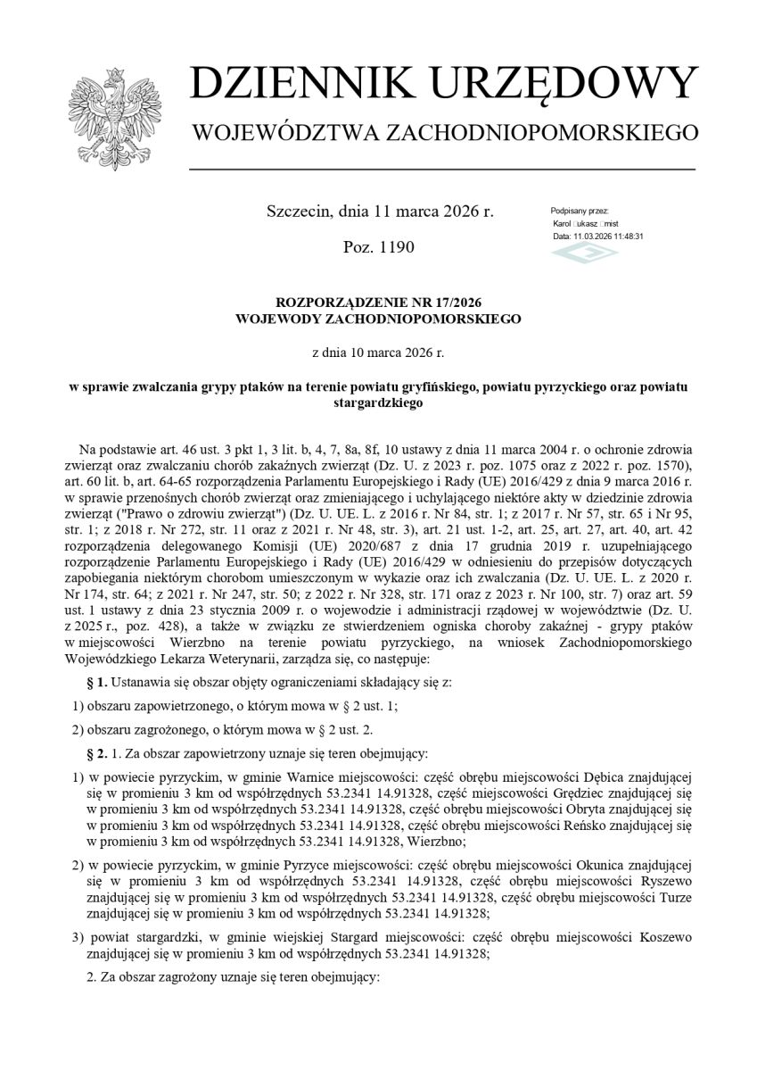 ROZPORZĄDZENIE NR 17/2026 WOJEWODY ZACHODNIOPOMORSKIEGO z dnia 10 marca 2026 roku w sprawie zwalczania grypy ptaków na terenie powiatu gryfińskiego powiatu pyrzyckiego oraz powiatu stargardzkiego