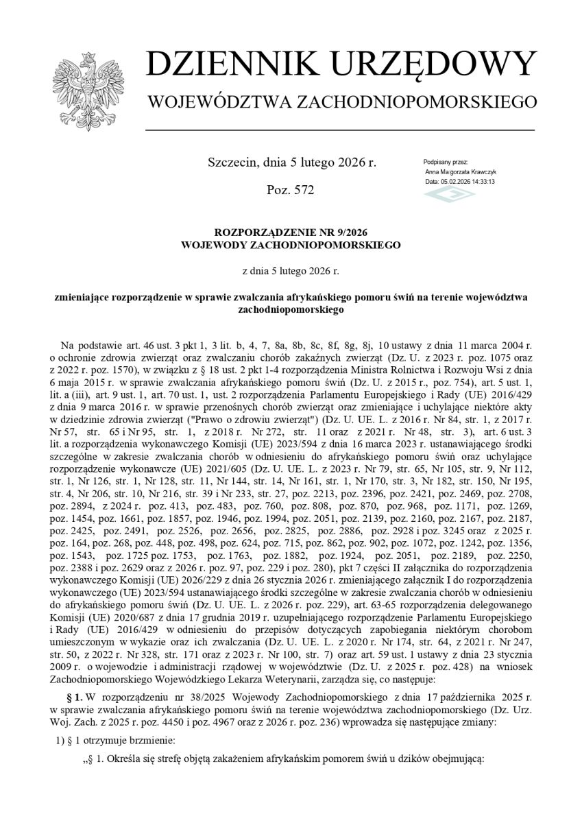 ROZPORZĄDZENIE NR 9/2026 WOJEWODY ZACHODNIOPOMORSKIEGO z dnia 5 LUTEGO 2026 roku rozporządzenie w sprawie zwalczania afrykańskiego pomoru świń na terenie województwa zachodniopomorskiego