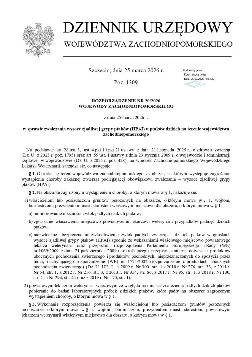 ROZPORZĄDZENIE NR 20/2026 WOJEWODY ZACHODNIOPOMORSKIEGO z dnia 25 marca 2026 roku rozporządzenie w sprawie zwalczania wysoce zjadliwej grypy ptaków ( HPAI ) u ptaków dzikich na terenie województwa zachodniopomorskiego