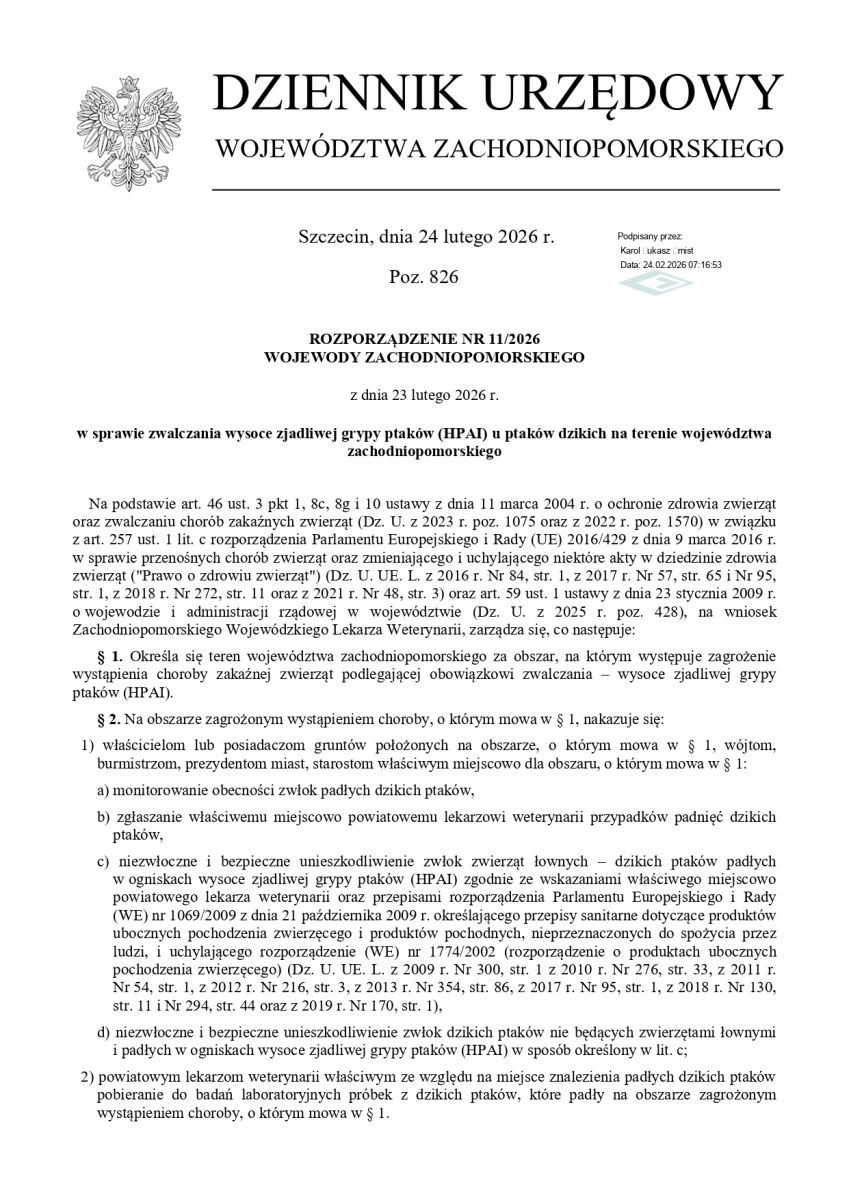 ROZPORZĄDZENIE NR 11 / 2026 WOJEWODY ZACHODNIOPOMORSKIEGO z dnia 23 LUTEGO 2026 roku rozporządzenie w sprawie zwalczania wysoce zjadliwej grypy ptaków ( HAPI)